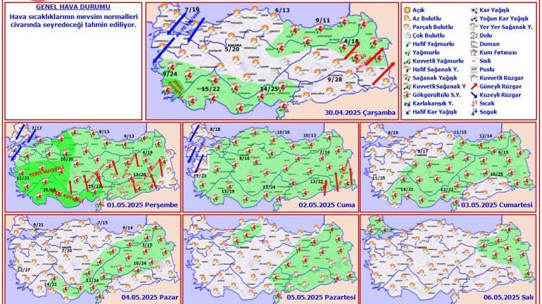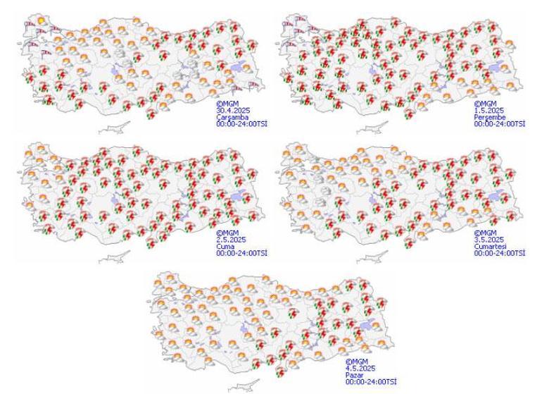 Meteoroloji Genel Müdürlüğü tarafından yapılan varsayımlara nazaran: Ülkemiz genelinin kesimli ve çok bulutlu, Ege (Kütahya hariç), Akdeniz, Doğu Karadeniz, Doğu Anadolu (Van ve Hakkari hariç) ve Güneydoğu Anadolu ile Karaman, Niğde, Konya, Kayseri, Sivas, Ordu ve Tokat etraflarının aralıklı sağanak ve gök gürültülü sağanak yağışlı geçeceği kestirim ediliyor. Yağışların; Denizli, Aydın, Kayseri ve Sivas etrafları ile Burdur’un batı kısımları, Antalya’nın batısının iç kesitlerinde yer yer kuvvetli olması bekleniyor. Sabah ve gece saatlerinde İç Anadolu’nun güney ve doğusu, Batı Karadeniz’in iç bölümleri, Orta ve Doğu Karadeniz ile Doğu Anadolu’da pus ve yer yer sis hadisesinin görüleceği varsayım ediliyor. Doğu Anadolu’nun güneydoğusu ile Güneydoğu Anadolu’da toz taşınımı bekleniyor.