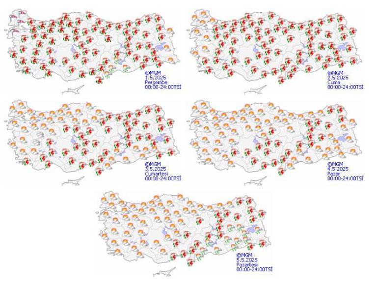 Meteoroloji Genel Müdürlüğü tarafından yapılan kestirimlere nazaran: Ülkemiz genelinin modüllü ve çok bulutlu, Marmara’nın batısı ile Iğdır ve Van etrafları dışında tüm yurdun aralıklı sağanak ve gök gürültülü sağanak yağışlı geçeceği iddia ediliyor. Yağışların, Güney Ege, Akdeniz, İç Anadolu’nun kuzeybatısı, Batı Karadeniz’in batısı ile Kocaeli, Sakarya, Bilecik, Kütahya, Uşak, Sivas, Tokat etrafları, Bursa ve Balıkesir’in güney bölümleri, Kayseri’nin güney ve doğusunda mahallî olmak üzere kuvvetli olması bekleniyor. Rüzgarın Marmara’da kuzey ve kuzeydoğu, Doğu Akdeniz, İç Anadolu’nun doğusu ile Doğu ve Güney Doğu Anadolu’da güneyli istikametlerden kuvvetli ve yer yer fırtına (40-80 km/sa) formunda eseceği varsayım ediliyor. Doğu Anadolu’nun güney ve batısı ile Güneydoğu Anadolu’da toz taşınımı bekleniyor.