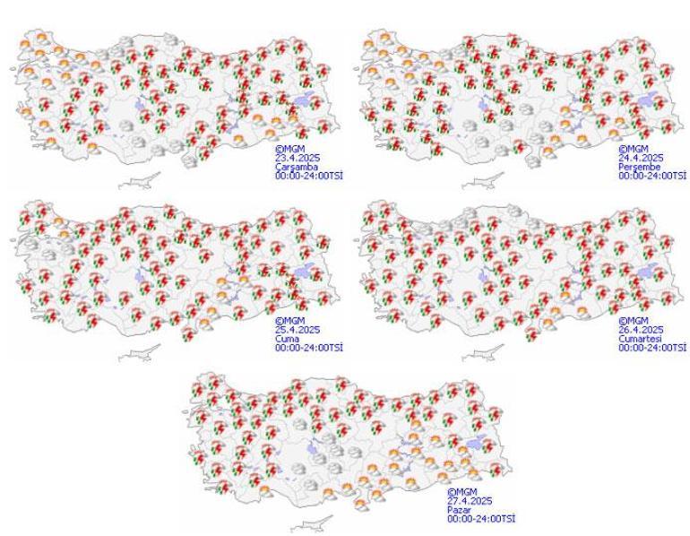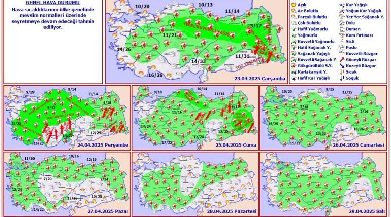 Yarından itibaren Türkiye genelinde mevsim normallerinin üstünde seyreden ılık hava, bilhassa yurdun kuzey ve doğu kesitlerinde periyodik sağanak ve gök gürültülü sağanaklarla gölgelenecek. Yarın, Karadeniz Bölgesi’nin iç ve doğu kıyılarında, Doğu Anadolu’da ve İç Anadolu’da yaygın yağış ile birlikte vakit zaman kuvvetli gök gürültülü sağanak öne çıkarken, ortalama 11–31 °C ortasında ılık bedeller hakim. Harita üzerinde Orta Anadolu’da toz taşınımı uyarısı da görüyoruz; bu bölgelerde yağışlarla havadaki tozun temizlenmesi bekleniyor. Perşembe ve Cuma günleri ise batıdan süratle ilerleyen yağış çizgileri Ege ve Akdeniz’in iç kısımlarına de iniyor; sıcaklıklarda batıdayken 15–27 °C, güneyde 14–33 °C üzere yüksek kıymetler ölçülürken İstanbul etrafı ve Trakya’da modüllü bulutlu, aralıklı sağanaklı bir hava sürüyor.