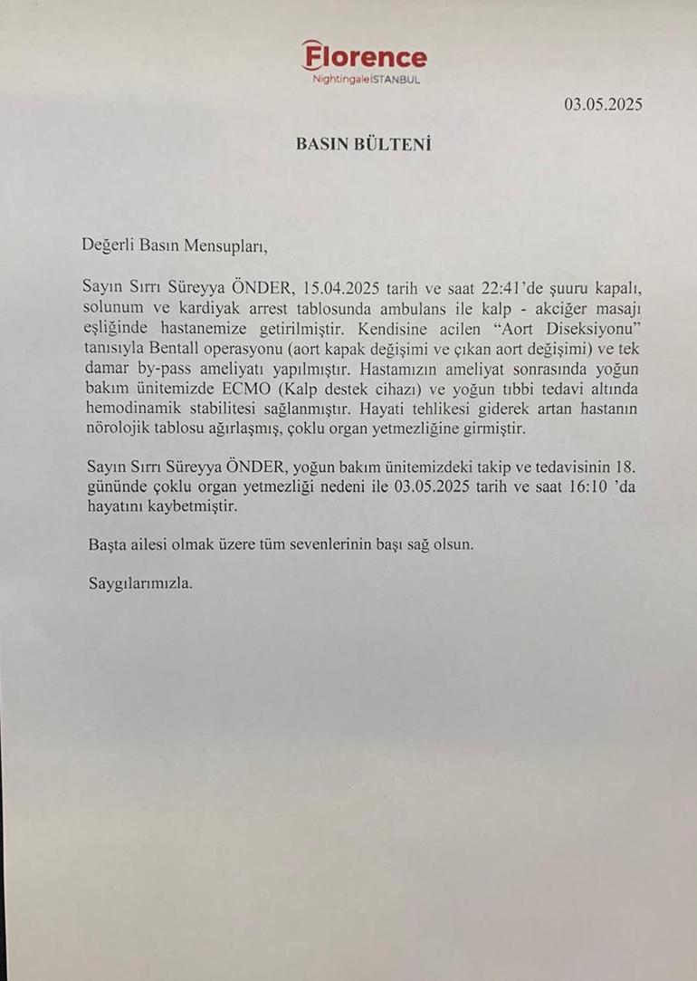Hastaneden yapılan yazılı açıklamada şu tabirlere yer verildi... Kaynak : Milliyet