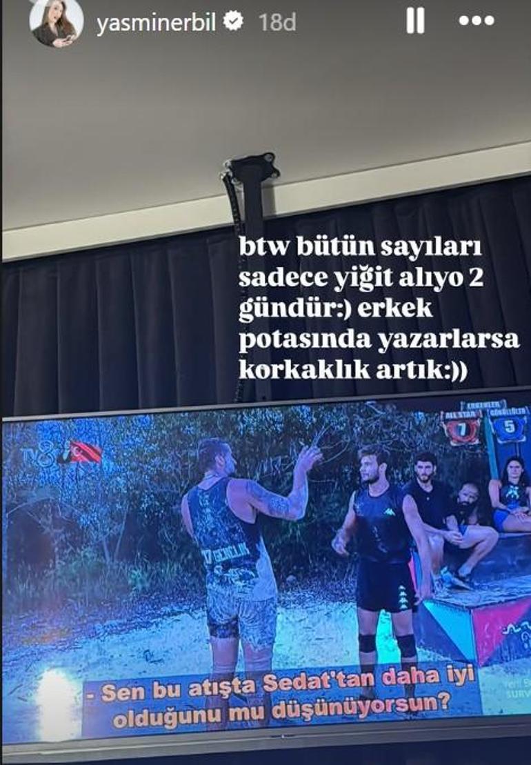 Gönüllüler ekibine gönderme yapan Survivor Yiğit’in sevgilisi Erbil, Instagram’daki paylaşımına ”Bütün sayıları yalnızca Yiğit alıyor 2 gündür. Erkek potasında yazarlarsa korkaklık artık” notunu düştü.