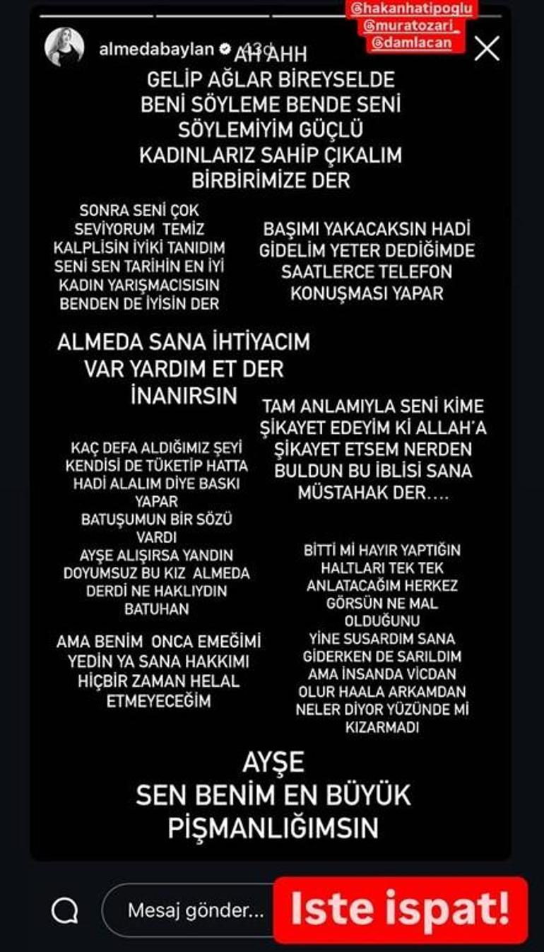 Survivor Almeda’nın toplumsal medyadan yazdıkları dikkat çekerken, Pınar Latife, Almeda Baylan’ın yazdıklarını kendi toplumsal medya hesabından alıntılayarak ‘İşte ispat’ notunu düştü.