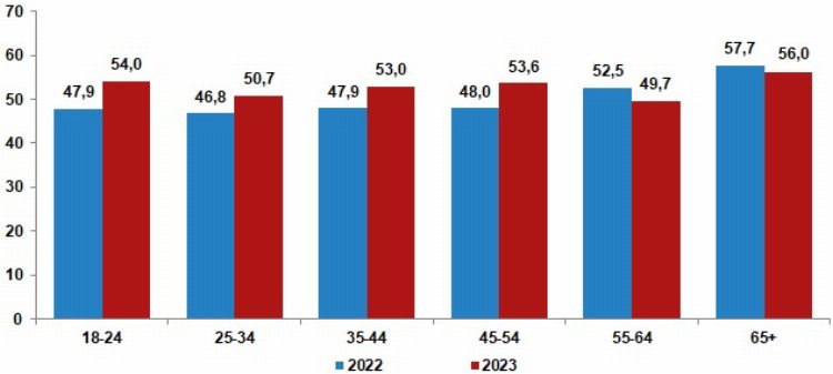 Yaş gruplarına göre mutluluk düzeyi incelendiğinde; 18-24 yaş grubunda mutluluk oranı, 2022 yılında yüzde 47,9 iken 2023 yılında 6,1 puan artarak yüzde 54,0 oldu.