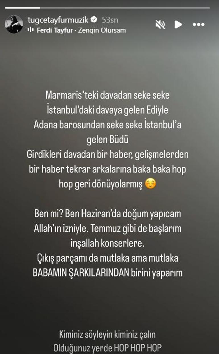Dava sonrası paylaşım yapan Tuğçe Tayfur, temmuz üzere konserlere başlayacağını söyledi. Tayfur yaptığı paylaşımda, “Marmaris’teki davadan seke seke İstanbul’daki davaya gelen Ediyle Adana barosundan seke seke İstanbul’a gelen Büdü girdikleri davadan bir haber, gelişmelerden bir haber tekrar artlarına baka baka hop geri dönüyorlarmış. Ben mi? Haziranda doğum yapacağım Allah’ın müsaadesiyle. Temmuz üzere de başlarım inşallah konserlere. Çıkış modülümü da kesinlikle lakin kesinlikle babamın müziklerinden birini yaparım. Kiminiz söyleyin kiminiz çalın. Olduğunuz yerde.” sözlerini kullandı.
