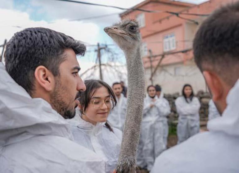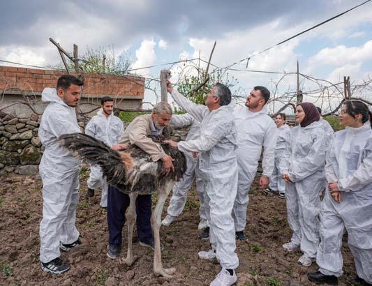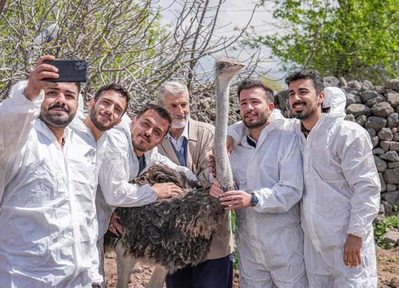 İlk kere bir deve kuşunu muayene etme imkanı bulan veteriner fakültesi öğrencileri “Hüdhüd” ile fotoğraf çektirdi.