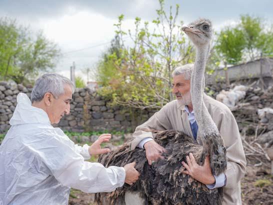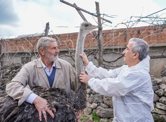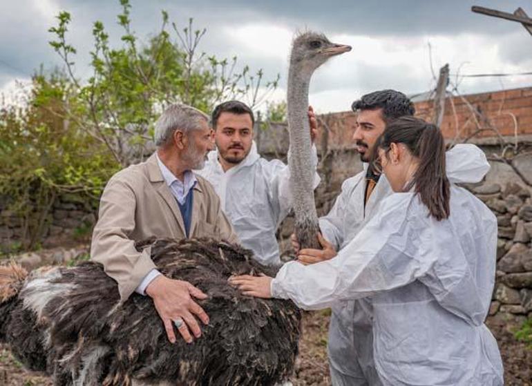 Mobil grup üyeleri, sahibinin “Hüdhüd” ismini verdiği deve kuşunu muayene etti.