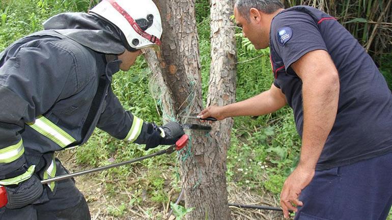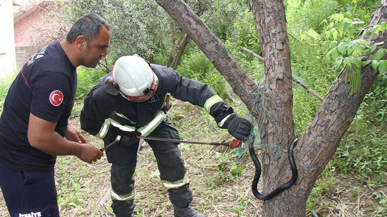 Kökez Mahallesi Belkıs mevkisinde, meskenin bahçesindeki ağaçta yer alan balık ağına dolanan yılanı çırpınırken gören kişi, durumu yetkililere bildirdi. İhbar üzerine olay yerine itfaiye takımı sevk edildi.