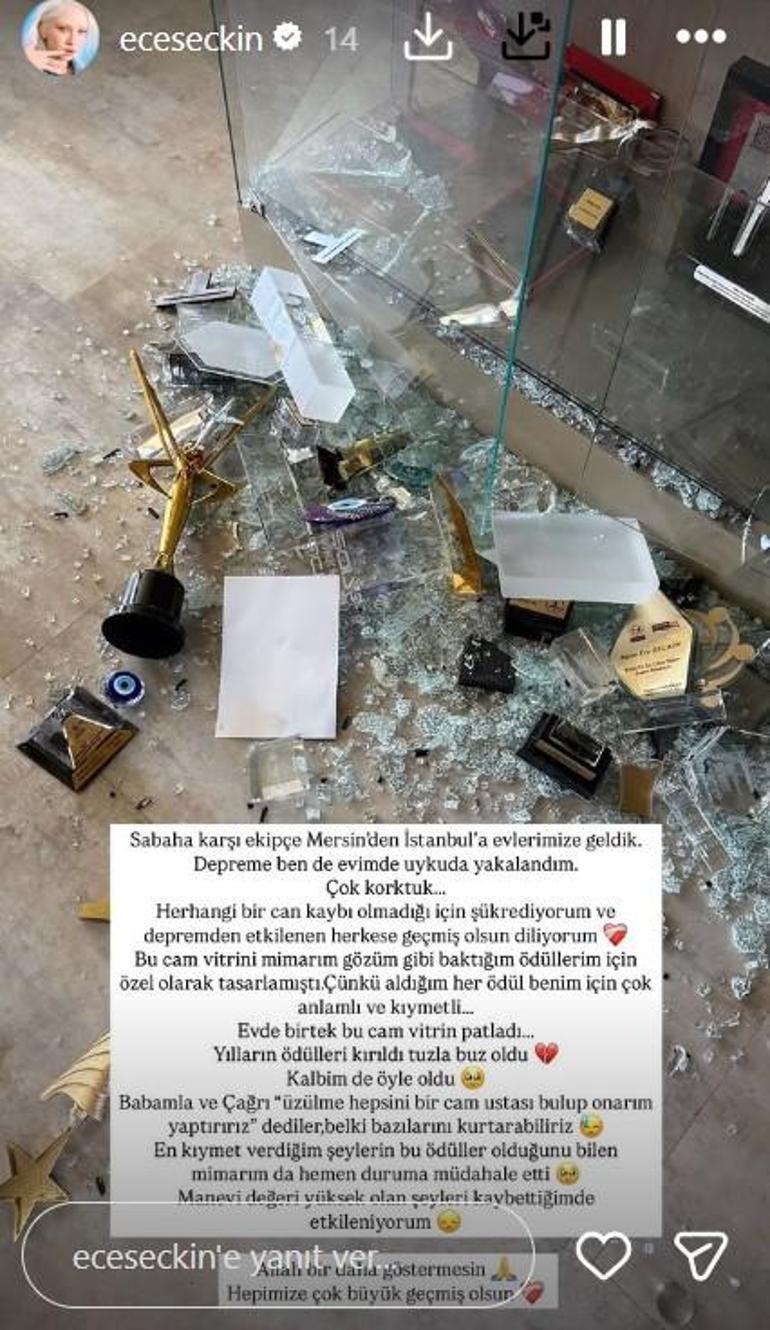 Ünlü müzikçi Ece Seçkin de sarsıntıya meskeninde uykuda yakalanan isimlerden biriydi. Seçkin ödüllerinin tuzla buz olduğunu açıkladı: